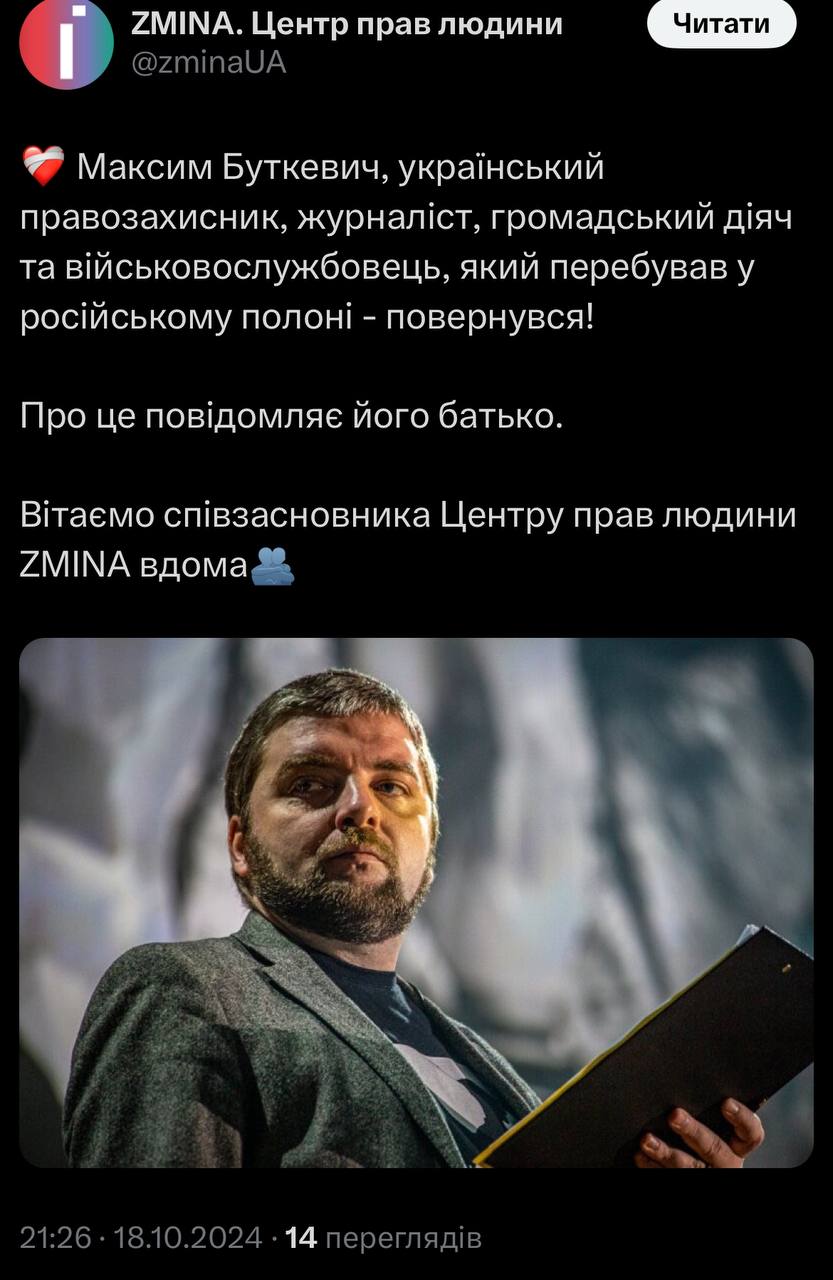 23.33 В рамках обмена в Украину вернули правозащитника, соучредителя Центра прав человека ZMINA Максима Буткевича, который служил в ВСУ и попал в плен ещё в 2022 году.