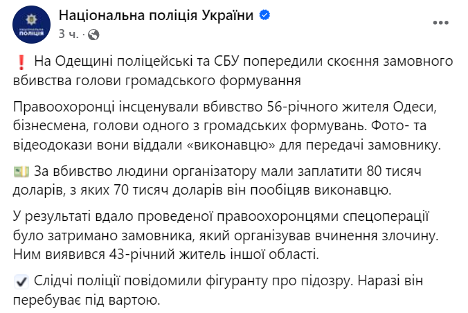 Национальная полиция сообщает, что совместно с СБУ сорвала покушение на "главу общественного формирования" Одессы.