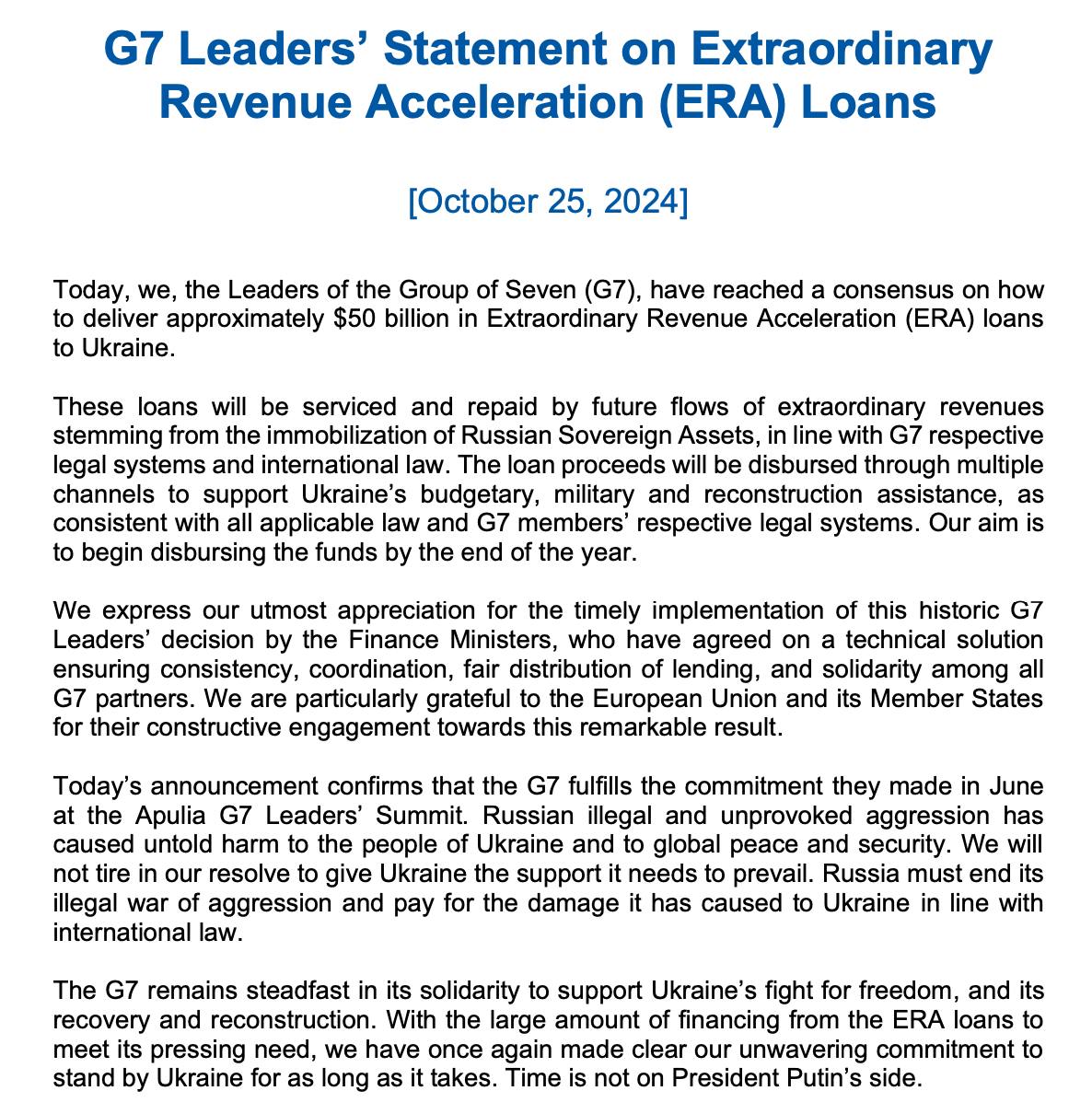 Страны "Большой семерки" согласовали механизм украинского кредита на 50 миллиардов долларов, выплачиваемого за счет доходов от замороженных российских активов.