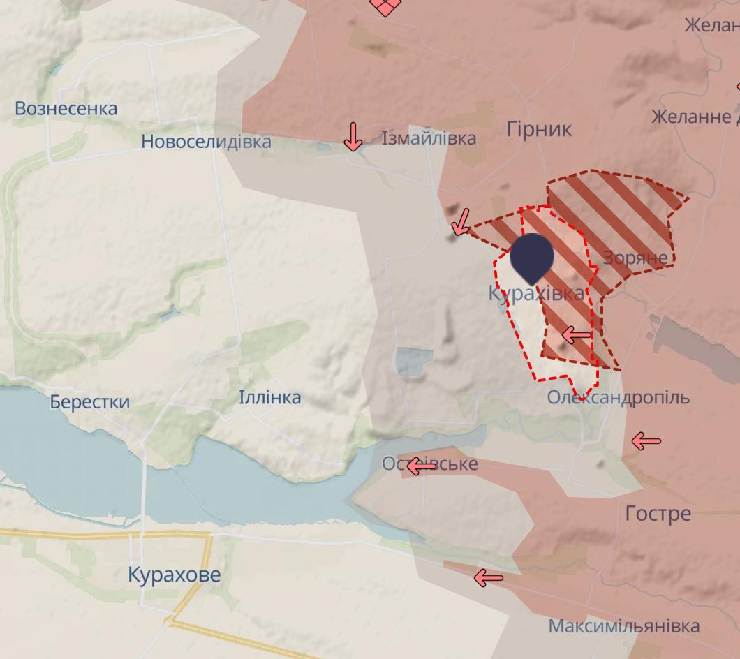 Сегодня лейтенант ВСУ с позывным "Алекс" заявил, что армия РФ «фактически заняла» Кураховку. Карта Deep State подтверждает существенное продвижение россиян на этом участке и полный захват соседнего Зоряного. По Кураховке же указано, что половина поселка находится в серой зоне, которая тянется далеко на запад, аж к подступам Ильинки.