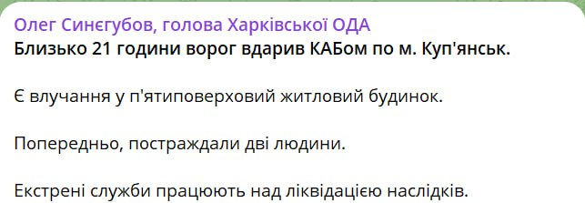 21.54 В Купянске прилет КАБа по пятиэтажке, сообщил глава Харьковской ОВА Синегубов.