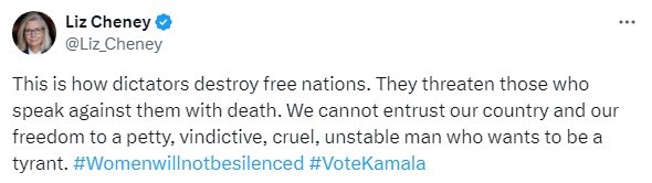 "Вот как диктаторы уничтожают свободные нации. Они угрожают смертью тем, кто выступает против них. Мы не можем доверить нашу страну и нашу свободу мелкому, мстительному, жестокому, нестабильному человеку, который хочет быть тираном", - написала Чейни в соцсети Х, сопроводив свой пост хэштегами "Женщины не будут молчать" и "Голосуйте за Камалу".