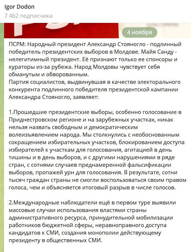 Заявление политсилы опубликовал в своем телеграм-канале экс-президент страны Игорь Додон.