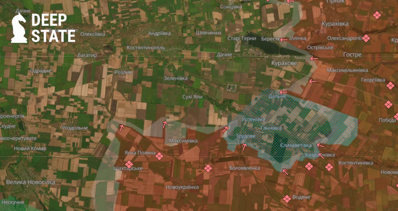 По мнению Deep State, задача армии РФ в этом районе – дойти до Старых Тернов, чтобы заблокировать основную дорогу, которая идет к Курахово с запада.