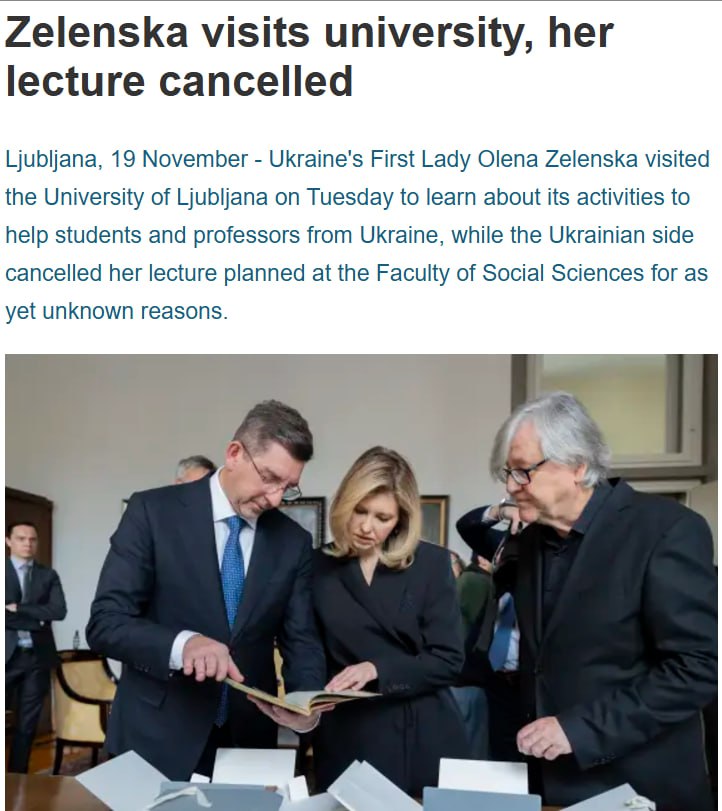 "Зеленская посетила во вторник университет в Любляне, чтобы ознакомиться с его деятельностью по помощи студентам из Украины, но украинская сторона отменила анонсированное выступление на факультете политических наук по неизвестным причинам", – передает агентство.