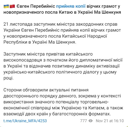 "Замминистра поздравил китайского чиновника с началом его дипломатической миссии в Украине и отметил позитивную динамику активизации украинско-китайского политического диалога в этом году. Стороны обсудили актуальные вопросы двусторонней повестки дня, в частности, в контексте использования значительного потенциала торгово-экономического сотрудничества между Украиной и Китаем, а также взаимодействия двух стран в многосторонних форматах", - отметили в министерстве.