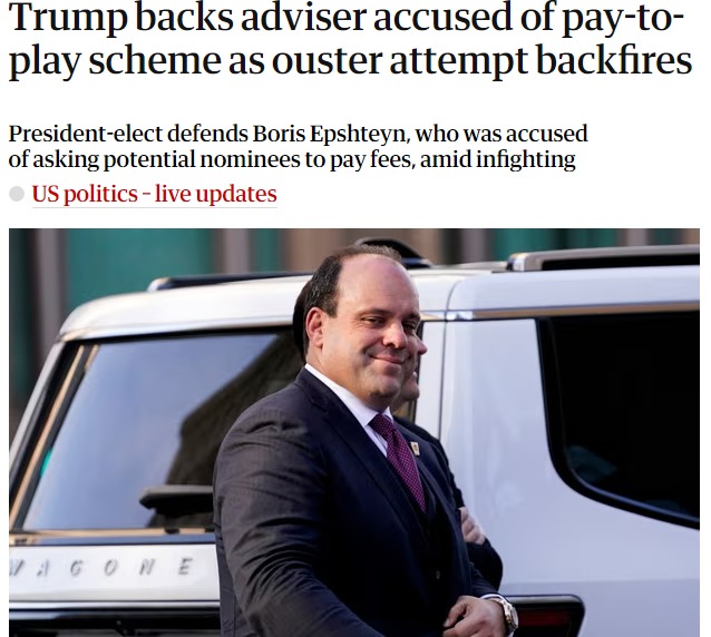 Дональд Трамп поддержал своего советника Бориса Эпштейна после утверждений о том, что тот просил потенциальных кандидатов в администрацию платить ежемесячные гонорары за консультации в обмен на лоббирование их интересов.