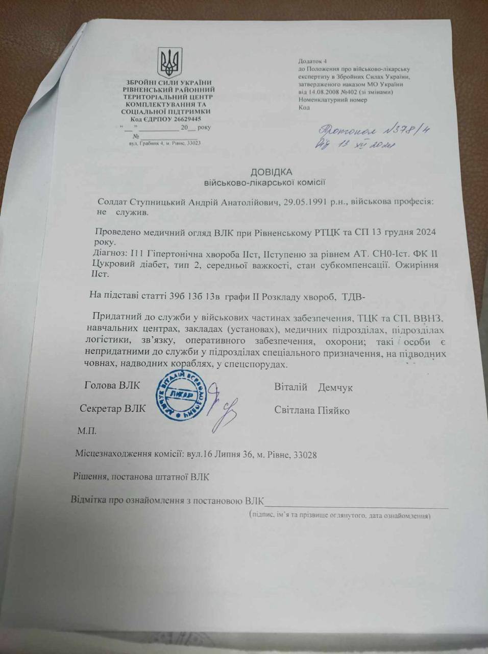 Канал также опубликовал заключение военной медкомиссии с диагнозами священника. Несмотря на них, Ступницкого признали годным к службе в частях обеспечения, ТЦК и подразделениях логистики.