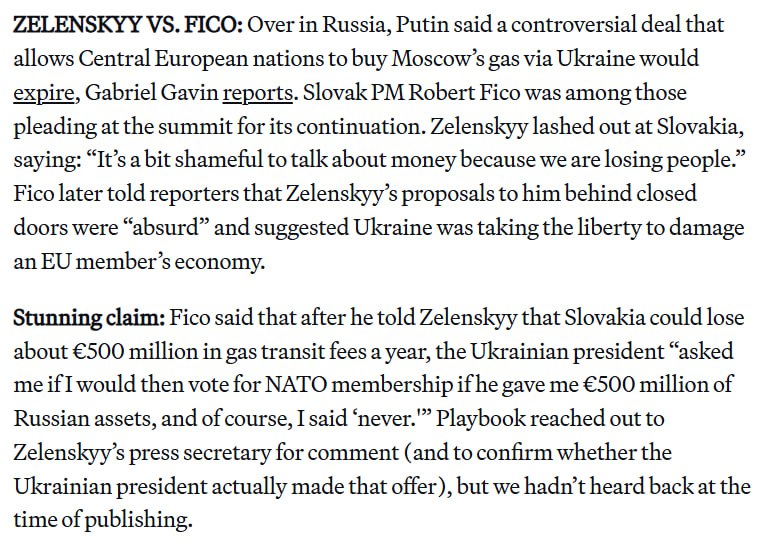 "Господин (Зеленский) вернулся к теме газа и спросил меня, голосовал бы я за членство (Украины) в НАТО, если бы он мне дал 500 миллионов евро из российских активов. Я, конечно, ответил: никогда", – рассказал Фицо.