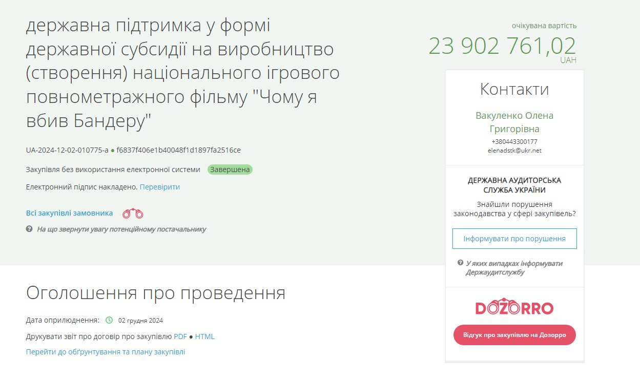 "Государственная поддержка в форме государственной субсидии на производство (создание) национального игрового полнометражного фильма "Почему я убил Бандеру", - озаглавлено объявление на сайте.