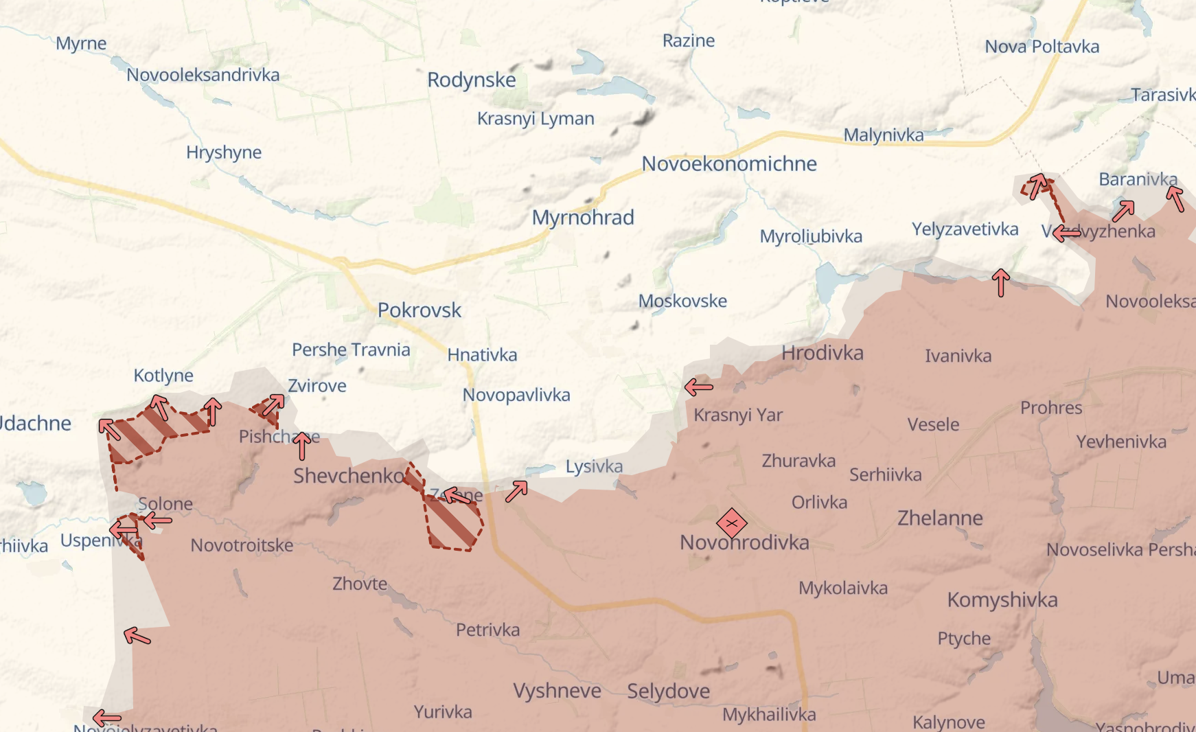 К востоку от Покровска и Мирнограда они, согласно карте военного паблика Deep State, приблизились к трассе на Константиновку. До нее осталось чуть более километра (Z-каналы утверждают, что трасса уже перерезана).