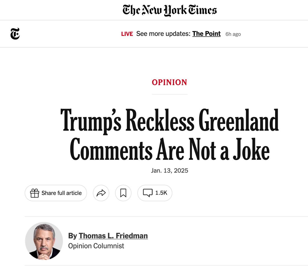 "Высказывания Трампа — это безрассудная глупость, в которую невозможно поверить. Представьте себе, что произойдет, когда выбранный им в качестве посла в Пекине Дэвид Пердью вступит в должность и в ответ на агрессивные действия Китая в отношении Тайваня отправится в китайский МИД, чтобы выразить протест. Что ответит министерство? Предположительно что-то вроде: "Вы пришли сюда протестовать против наших действий по воссоединению с Тайванем, когда ваш президент угрожает силой захватить Гренландию и Панамский канал? Мы считаем Тайвань неотъемлемой частью Китая — это убеждение, хотя вы его и не разделяете, вы признали в Шанхайском коммюнике 1972 года. Как вы связаны с Гренландией? Тем, что Дональд Трамп-младший однажды ездил туда в отпуск? Скажите своему президенту, что Китай и Россия имеют такие же права на Гренландию, как и Америка", - написал Фридман.