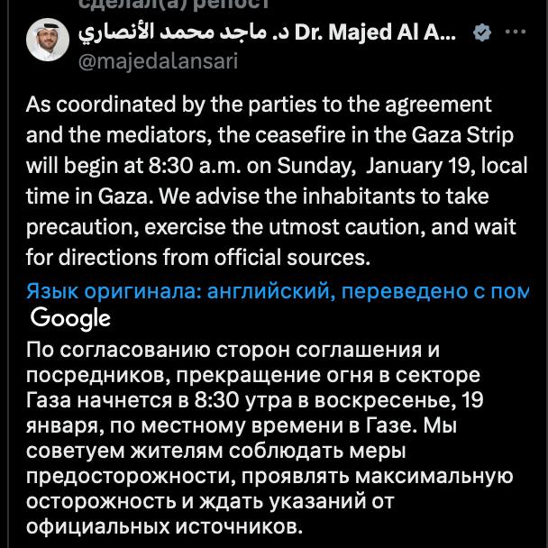 В свою очередь правительство Израиля утвердило сделку с ХАМАС о прекращении огня и обмене пленными и освобождении заложников. Ранее сообщалось, что первых заложников отпустят утром воскресенья.