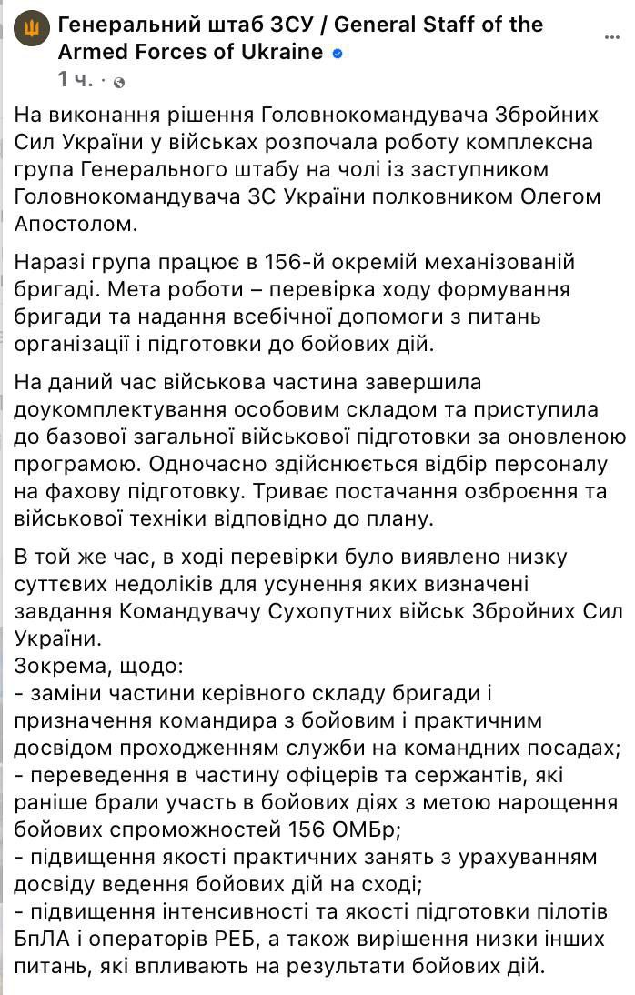20:47 Генштаб планирует заменить командира 156-й бригады из-за выявленных «существенных недостатков» при подготовке личного состава.