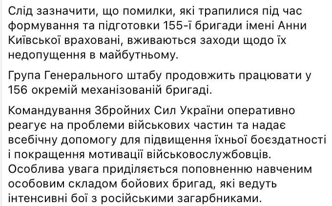Какие именно недостатки обнаружены, не сообщается. При этом заявляется, что «ошибки, случившиеся при формировании и подготовке 155-й бригады имени Анны Киевской учтены, принимаются меры по их недопущению в будущем».