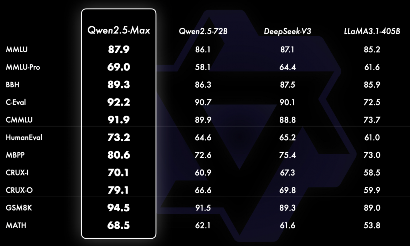 По словам разработчиков, модель превосходит ChatGPT и DeepSeek по многим показателям, или, как говорят в специалисты в сфере искусственного интеллекта, бенчмаркам: Arena-Hard, LiveBench, LiveCodeBench и GPQA-Diamond. Также новинка демонстрирует близкие к конкурентам результаты в других бенчмарках, например MMLU-Pro.