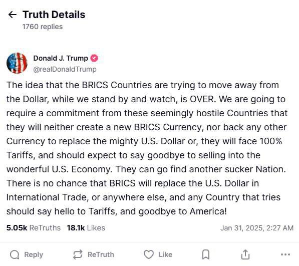 "Идея о том, что страны БРИКС пытаются отказаться от доллара, пока мы просто наблюдаем, закончена. Мы будем требовать от этих, вероятно, враждебных стран обязательств не создавать новую валюту БРИКС и не поддерживать никакую другую валюту, которая могла бы заменить могущественный доллар США. В противном случае их ждут 100% тарифы, и они могут попрощаться с возможностью продавать свои товары в великолепную экономику США. Пусть найдут другую страну-лоха. Нет никакой возможности, что БРИКС заменит доллар в международной торговле или где-либо ещё, и любая страна, которая попытается это сделать, должна готовиться к тарифам и прощаться с Америкой!" - написал президент США.