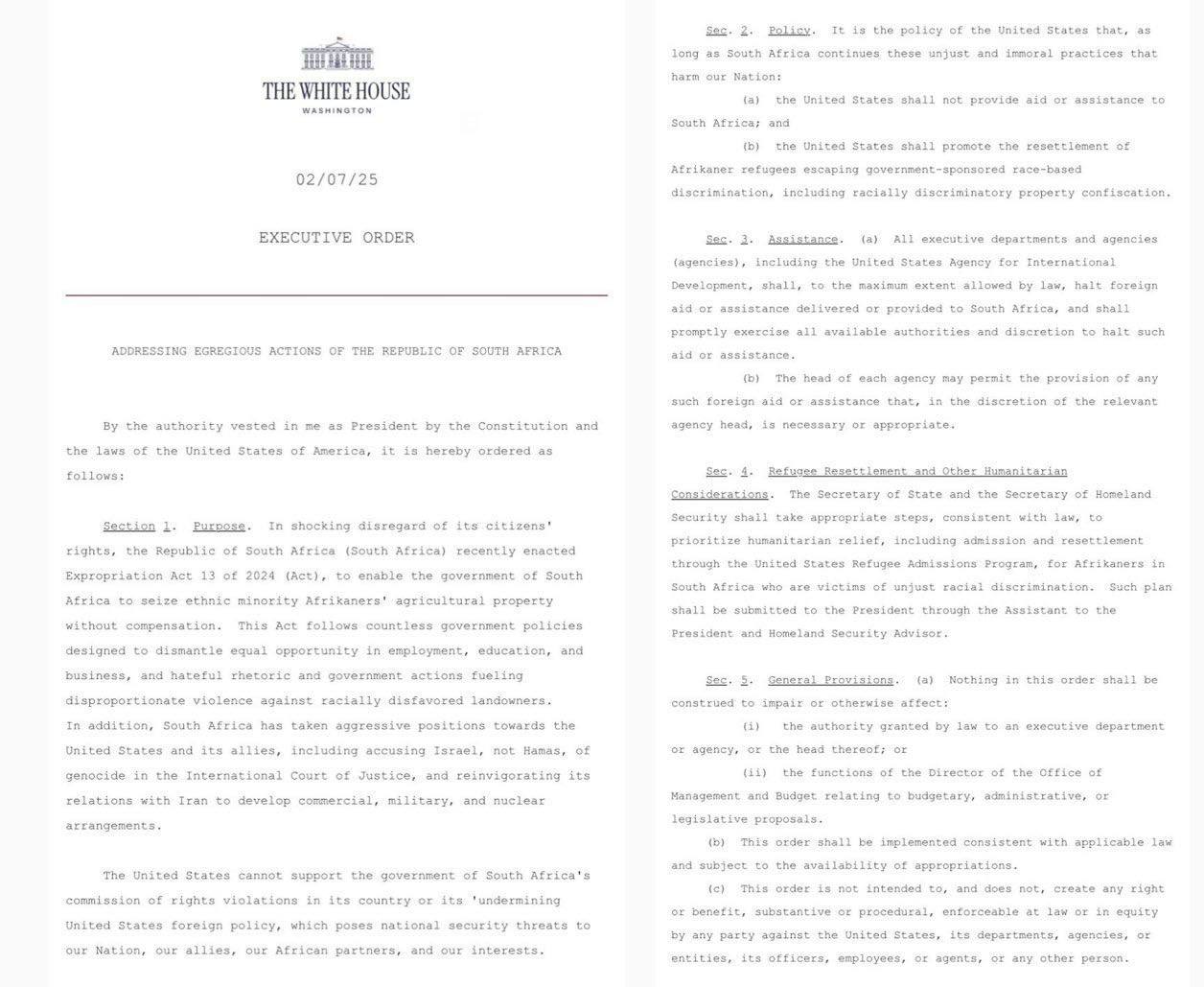В постановлении за подписью Трампа говорится, что Соединенные Штаты "не могут поддерживать правительство Южной Африки, совершающее нарушения прав в своей стране, или вести подрывную внешнюю политику в отношении США".
