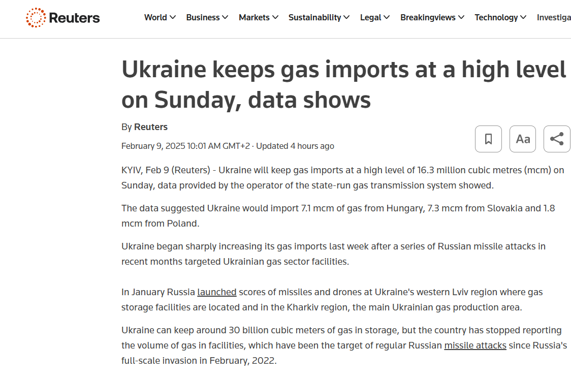 Согласно данным, Украина импортирует 7,1 млн куб. м газа из Венгрии, 7,3 млн куб. м из Словакии и 1,8 млн куб. м из Польши.