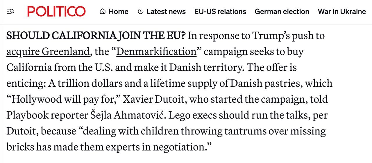 В Дании вновь отреагировали на угрозы президента США Дональда Трампа захватить Гренландию. Датская инициативная группа Denmarkification предлагает выкупить американский штат Калифорния.