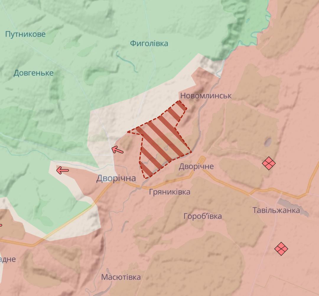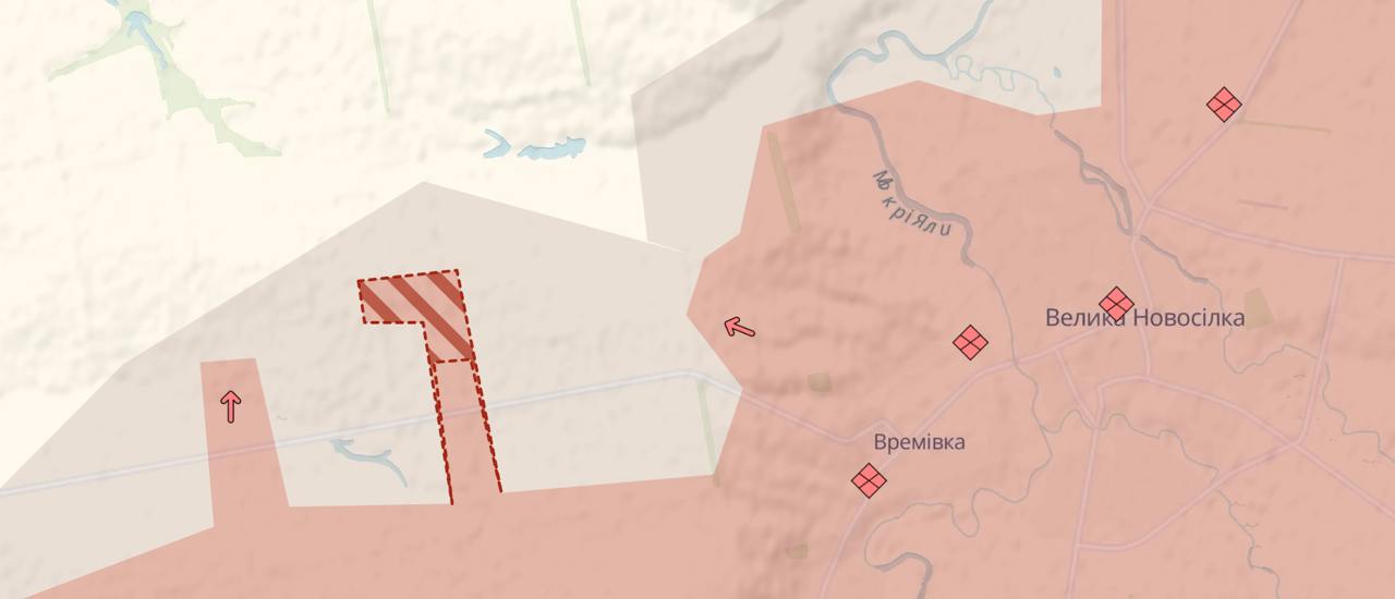 Армия РФ продолжает наступление западнее Великой Новоселки в Донецкой области. Об этом свидетельствует карта военного паблика Deep State.