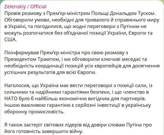 Зеленский и Туск по телефону решили, что переговоры с РФ невозможны без общей позиции Украины, Европы и США