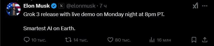 "Выпуск Grok 3 с демоверсией в понедельник в 20:00 по тихоокеанскому времени. Самый умный ИИ на Земле", - написал Маск.