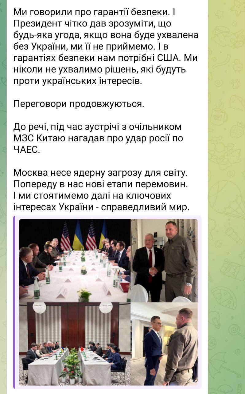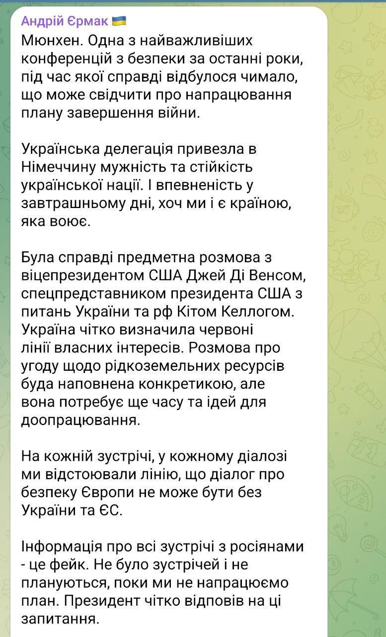 Глава ОП отметил, что во время встреч в Мюнхене с вице-президентом США Джей Ди Вэнсом и другими американскими официальными лицами Украина получила обязательства по продолжению поддержки и политическую волю достичь устойчивого мира.