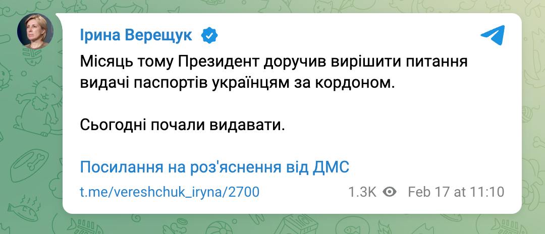 Об этом сообщает замглавы Офиса президента Ирина Верещук.