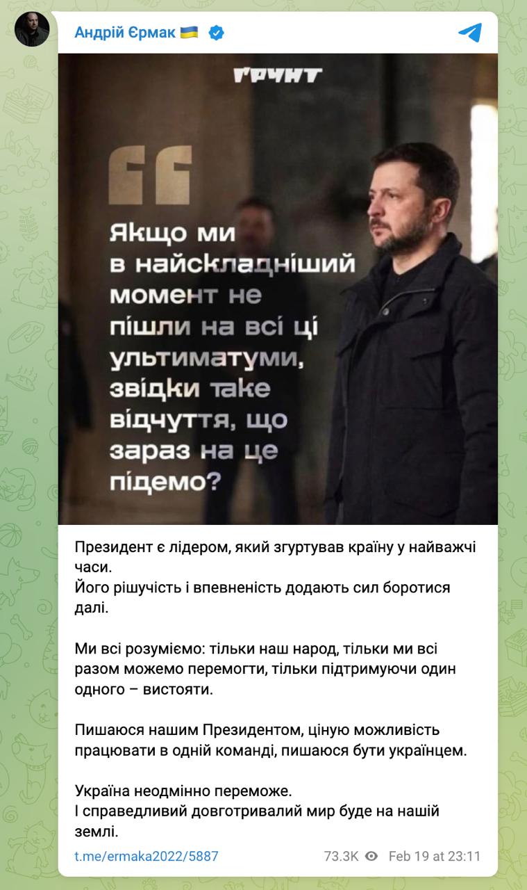 Например, пост об этом в своем телеграм-канале опубликовал глава Офиса президента Андрей Ермак. Он заявил, что гордится президентом и ценит возможность работать с ним в одной команде.