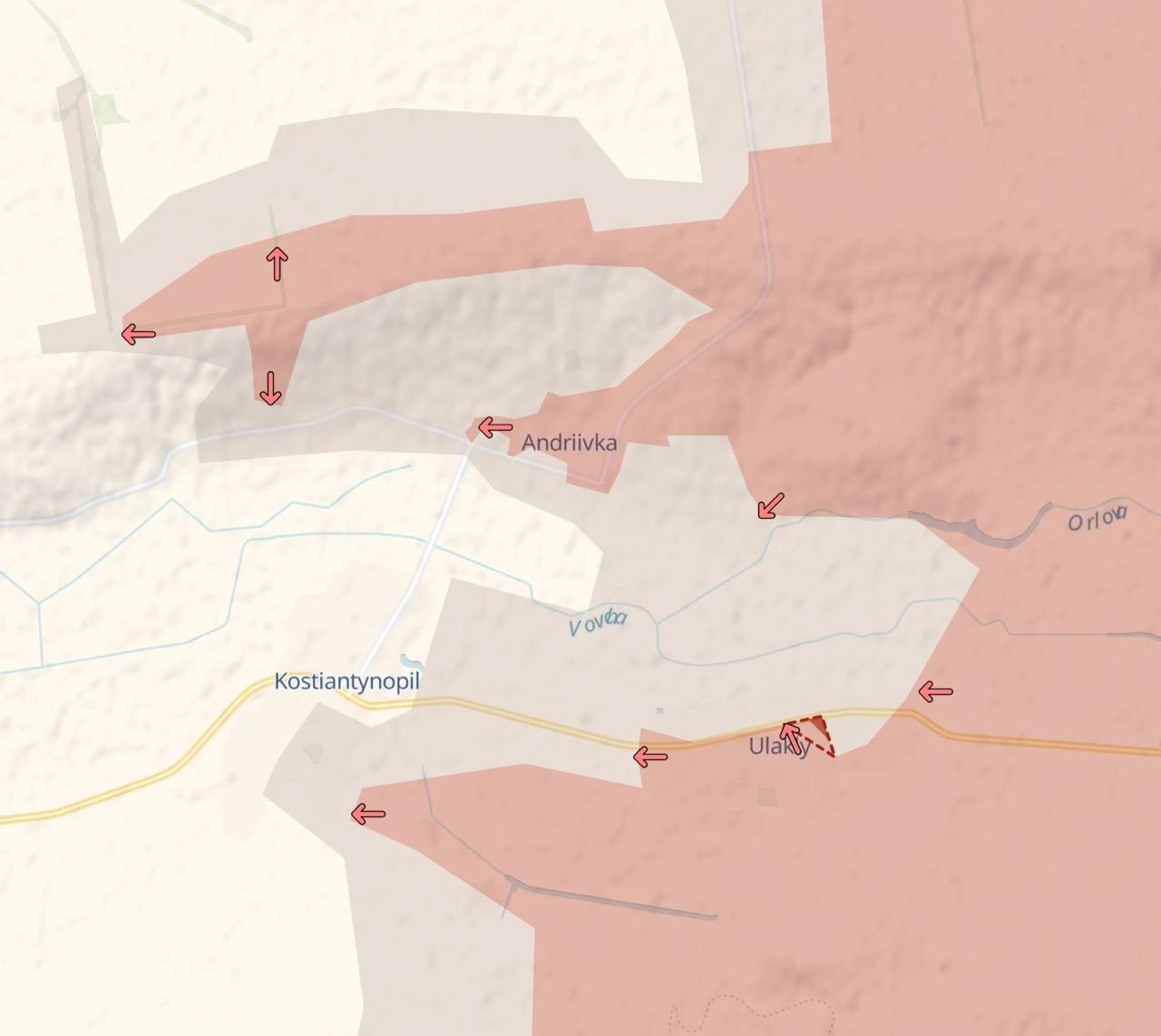 Военный обозреватель Богдан Мирошников указывает, что одновременно россияне продвигаются в районе села Разлив, чтобы обойти и зажать Константинополь с запада и оформить оперативное окружение.