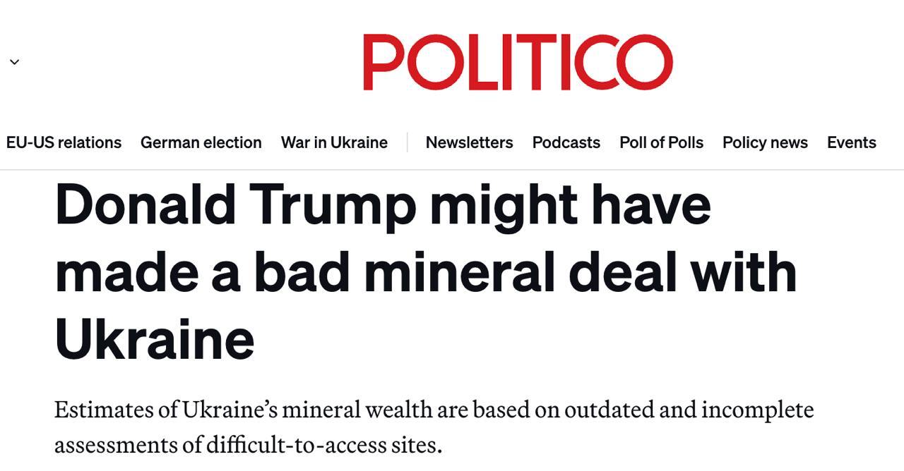 "Трамп может получить меньше, чем рассчитывал. Оценки предполагаемых минеральных богатств Украины основаны на устаревших исследованиях советских времен, которые не учитывали жизнеспособность или стоимость их разработки. Даже если дальнейшие исследования подтвердят наличие ценных месторождений полезных ископаемых, их добыча займет много времени и потребует больших денежных затрат", - пишет издание.