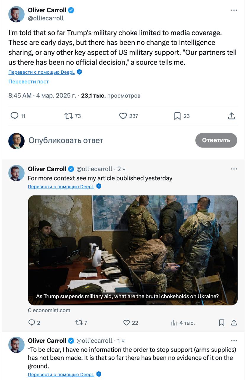 "Мне сказали, что до сих пор военное удушение со стороны Трампа ограничивается лишь освещением в СМИ. Это только начало, но изменений в обмене разведданными или других ключевых аспектах военной поддержки США не произошло. У меня нет информации, что приказ о прекращении поставок оружия не был отдан. Просто до сих пор не было никаких доказательств этого на местах", - написал Кэрролл.