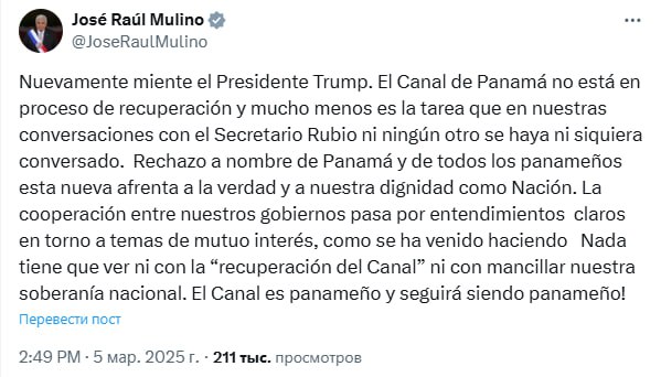 "Снова президент Трамп лжет. Панамский канал не находится в процессе возвращения, и это точно не та задача, которая даже обсуждалась в наших разговорах с секретарем Рубио или кем-то другим. От имени Панамы и всех панамцев я отвергаю это новое оскорбление правды и нашего достоинства как нации", – заявил президент Панамы.