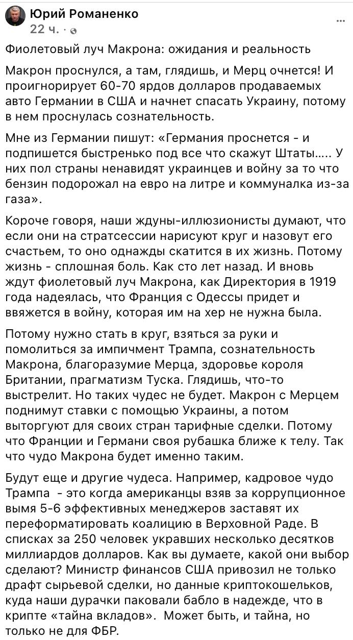 "Макрон с Мерцем поднимут ставки с помощью Украины, а потом выторгуют для своих стран тарифные сделки. Потому что Франции и Германии своя рубашка ближе к телу", - пишет он.
