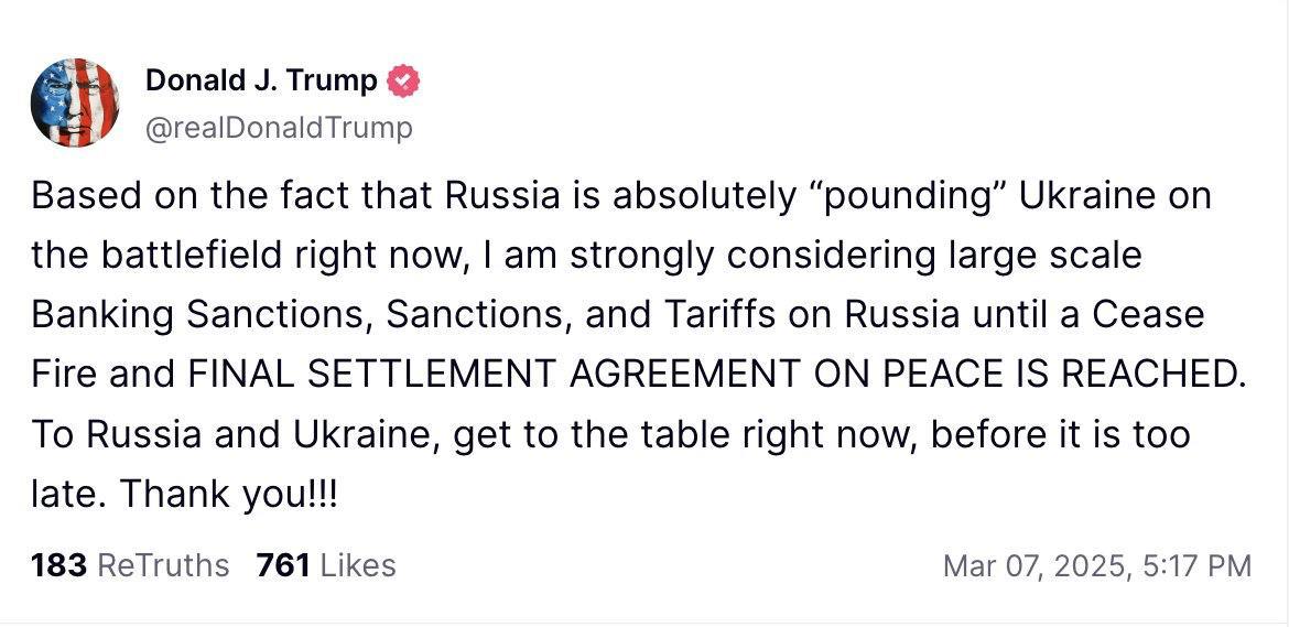 "Учитывая тот факт, что Россия сейчас абсолютно "разносит" Украину на поле боя, я всерьёз рассматриваю возможность введения масштабных банковских санкций, санкций и тарифов против России до тех пор, пока не будет достигнуто прекращение огня и окончательное мирное соглашение. Россия и Украина, садитесь за стол переговоров немедленно, пока не стало слишком поздно", - призвал президент США.