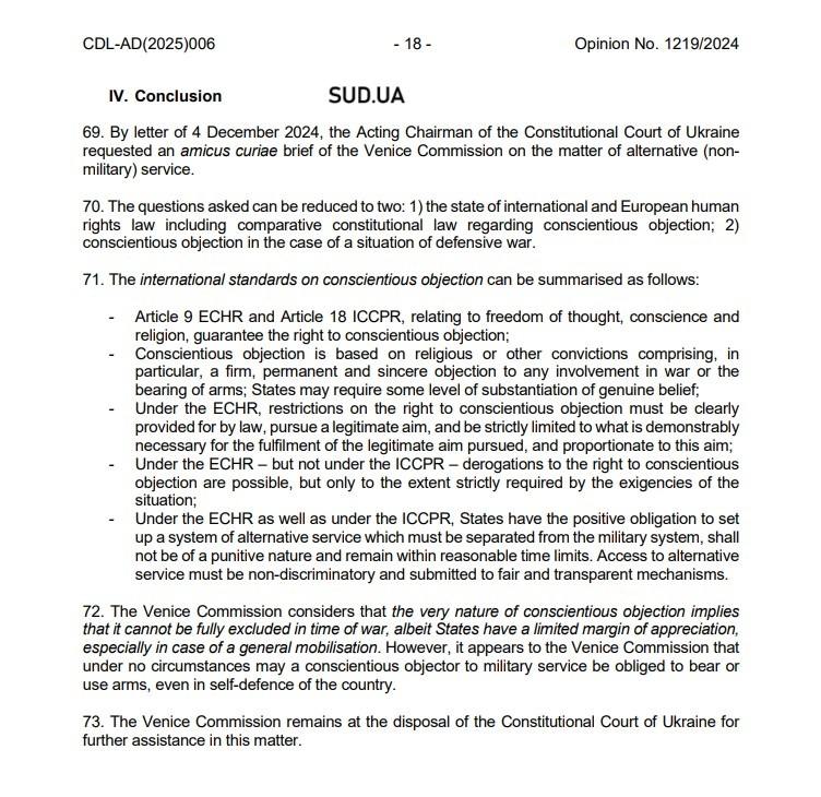 Такое заключение вынесла Венецианская комиссия по запросу Конституционного суда Украины (КСУ), который рассматривал дело о мобилизации члена Церкви адвентистов седьмого дня.