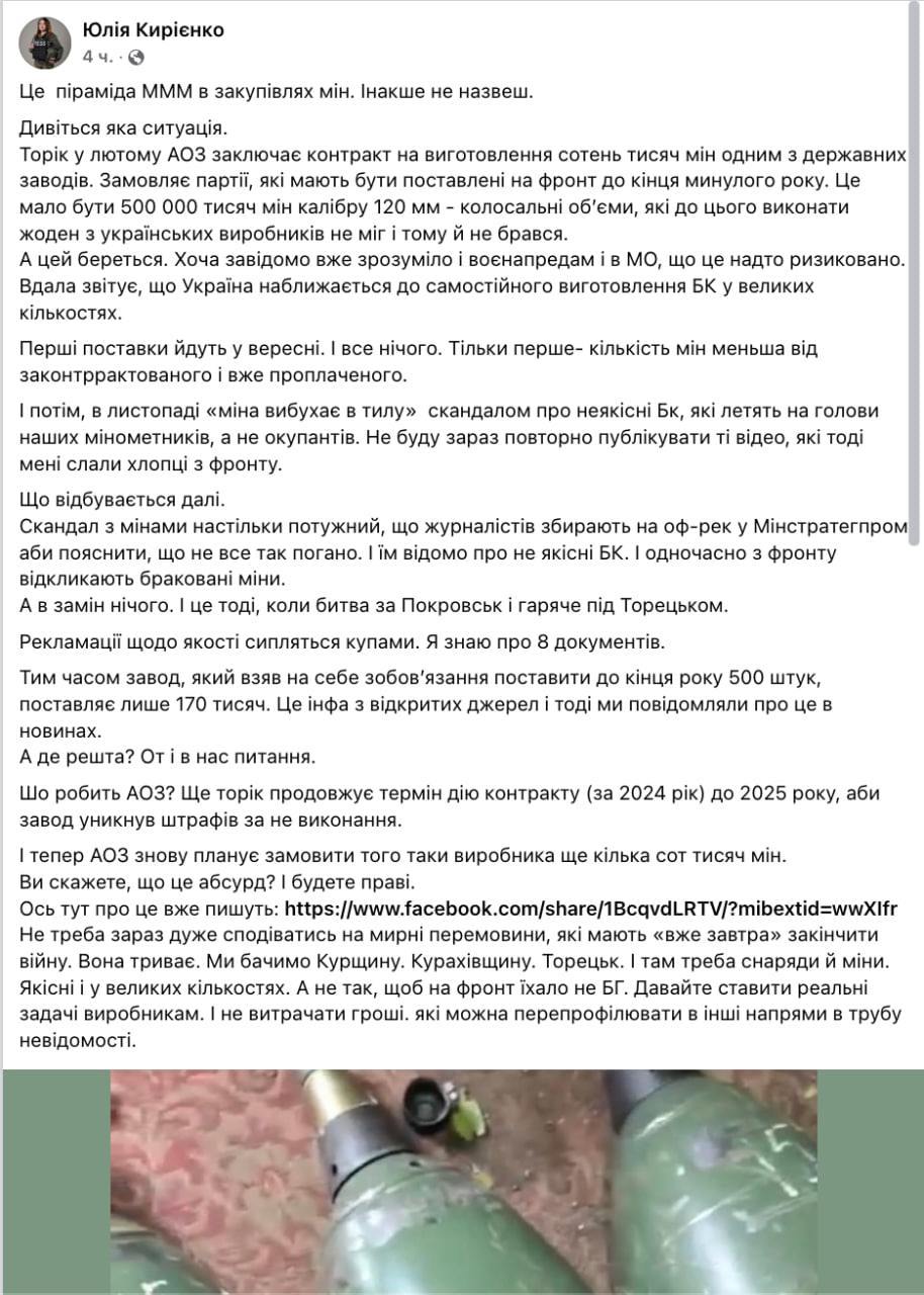 Как сказано в публикации, из 500 тысяч мин калибра 120-мм, которые должны были поставить ВСУ до конца года, государственный завод  передал только 170 тысяч. Несмотря на это, с заводом продлили срок действия контракта на 2025 год, "чтобы завод избежал штрафов за невыполнение".