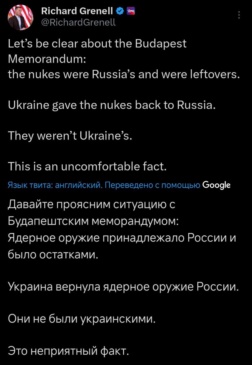 Украина вернула ядерное оружие России. Оно не было украинским. Это неприятный факт", - написал в соцсети Х советник Трампа по особым поручениям Ричард Гренелл.