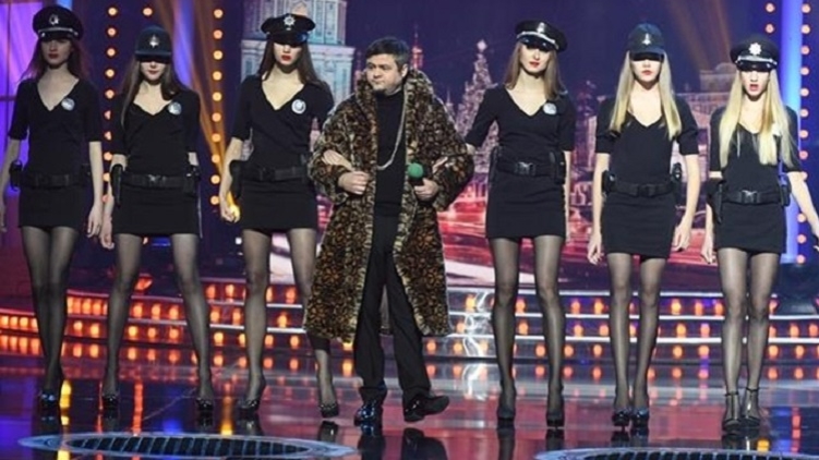 Во время концерта, который снимали три недели назад для новогоднего эфира "1+1", показали очень смешной номер о министре МВД Арсене Авакове, которого играл Юрий Крапов, одетый в стиле гламурного рэп-испонителя: в шубе, с золотыми цепями и в окружении сексапильных цыпочек - см. фото выше. Длинноногие красотки были одеты в форму полиции… из секс-шопа, изображая помощниц и заместительниц Авакова.