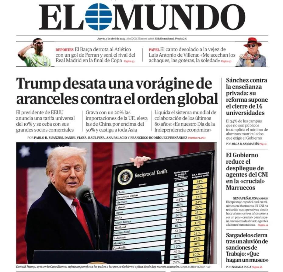 Мировые СМИ вынесли пошлины Трампа, введенные против всех стран, на свои обложки.
