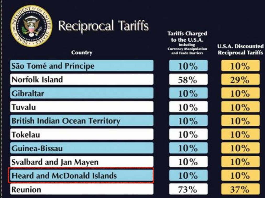 Также Трамп обложил пошлинами необитаемые острова Херд и Макдональд. Против них ввели 10-процентные тарифы.