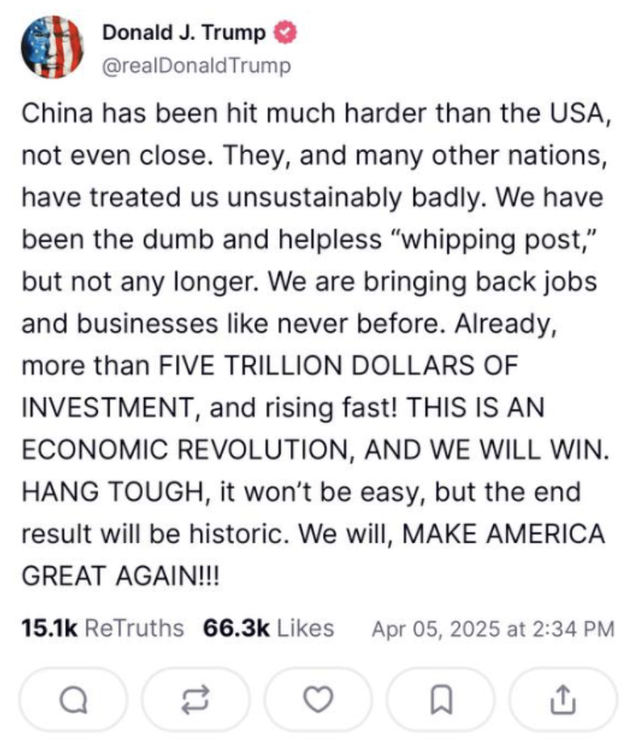 "Китай пострадал гораздо сильнее, чем США, даже близко не пострадали. Они и многие другие страны относились к нам плохо. Мы были тупым и беспомощным "местом для порки", но больше нет. Мы возвращаем рабочие места и бизнес, как никогда раньше. Уже более пяти триллионов долларов инвестиций и быстрый рост! Это экономическая революция и мы победим. Это будет нелегко, но конечный результат будет историческим. Мы сделаем Америку снова великой", - написал Трамп.