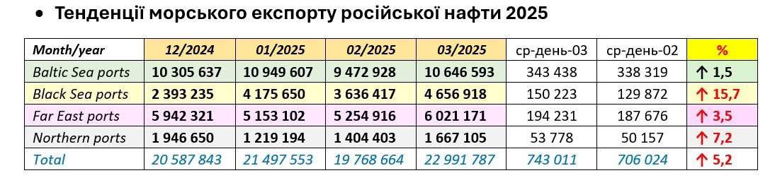 "В марте 2025 года снижение сменилось ростом, по всем морям на 5,2% в целом... Это означает, что санкции против танкеров не сработали. Объёмы экспорта говорят сами за себя, То есть, огромный объём санкционированных танкеров (около 400) не привёл к дефициту судов на рынке перевозок из РФ", - уточняет Клименко.