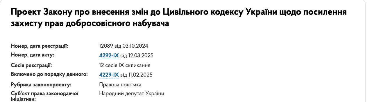 В Верховной Раде считают, что закон защищает права и интересы добросовестного приобретателя в случае выбывания имущества из собственности государства или территориальной общины и решает вопрос компенсации при истребовании имущества в пользу государства или общины.