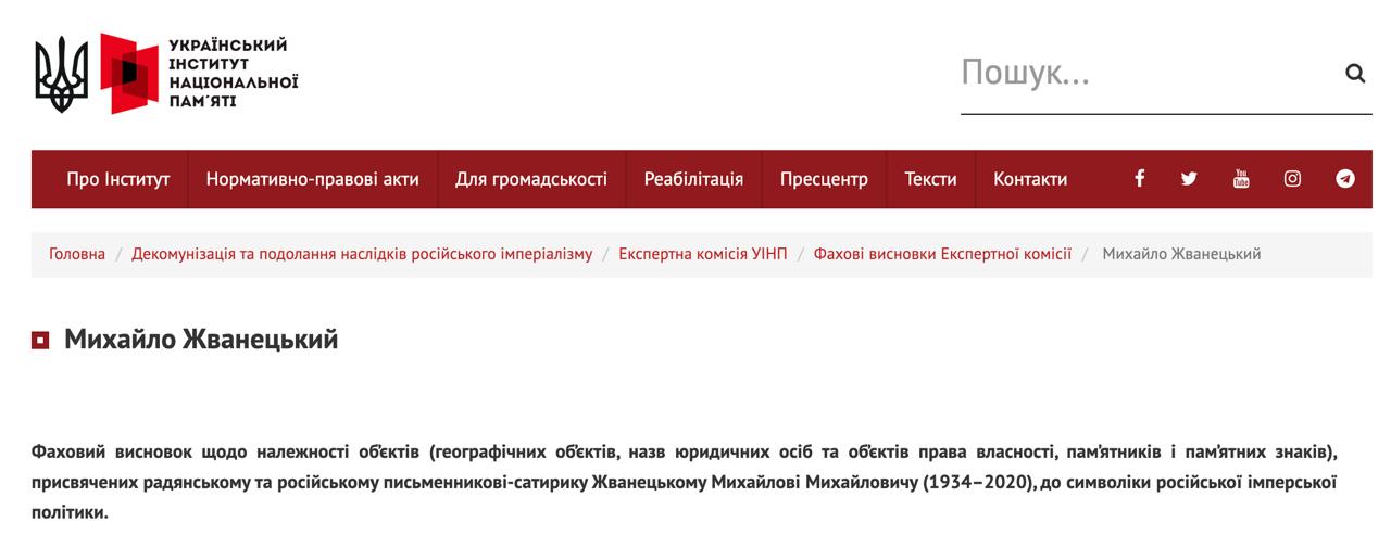 В УИНП резюмировали, что имя Жванецкого в названиях улиц и других топонимах "является пропагандой российской имперской политики".