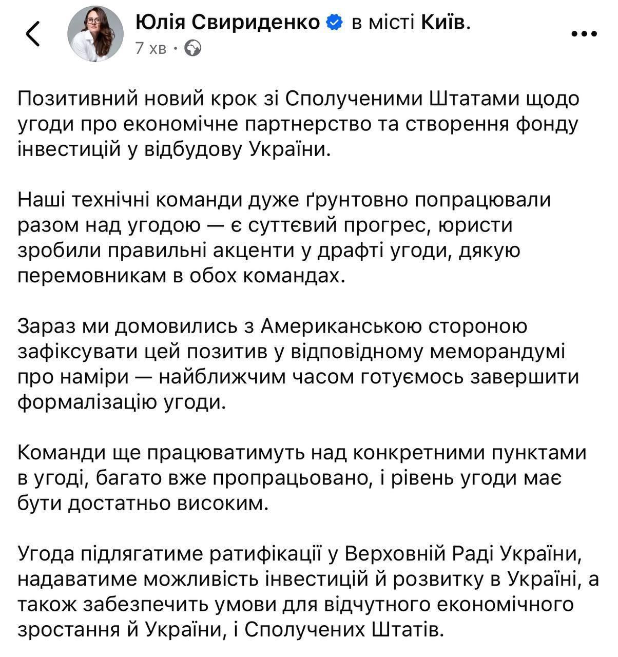 "Сейчас мы договорились с американской стороной зафиксировать этот позитив в соответствующем меморандуме о намерениях — в ближайшее время готовимся завершить формализацию сделки", - сказано в публикации Свириденко.