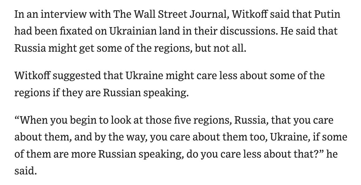 При этом он заявляет, что Украине могут быть "менее важны" ее русскоязычные регионы, пишет The Wall Street Journal ссылаясь на комментарий Уиткоффа.