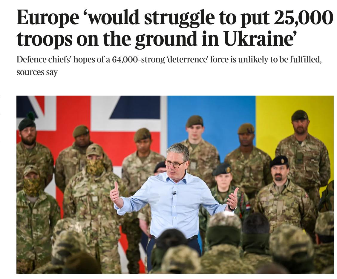 Европа точно не сможет разместить в Украине контингент из 64 тысячи военных, как планировалось ранее. Также ей "будет трудно разместить 25 000 военнослужащих в Украине", хотя эта цифра может обсуждаться.