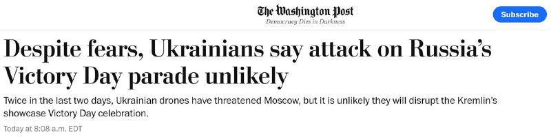 А высокопоставленный представитель украинских Сил обороны заявил The Washington Post, что Украина вряд ли будет пытаться бить по параду в Москве из-за "низких шансов на успех". Вместо этого ВСУ могут ударить по другим регионам РФ.